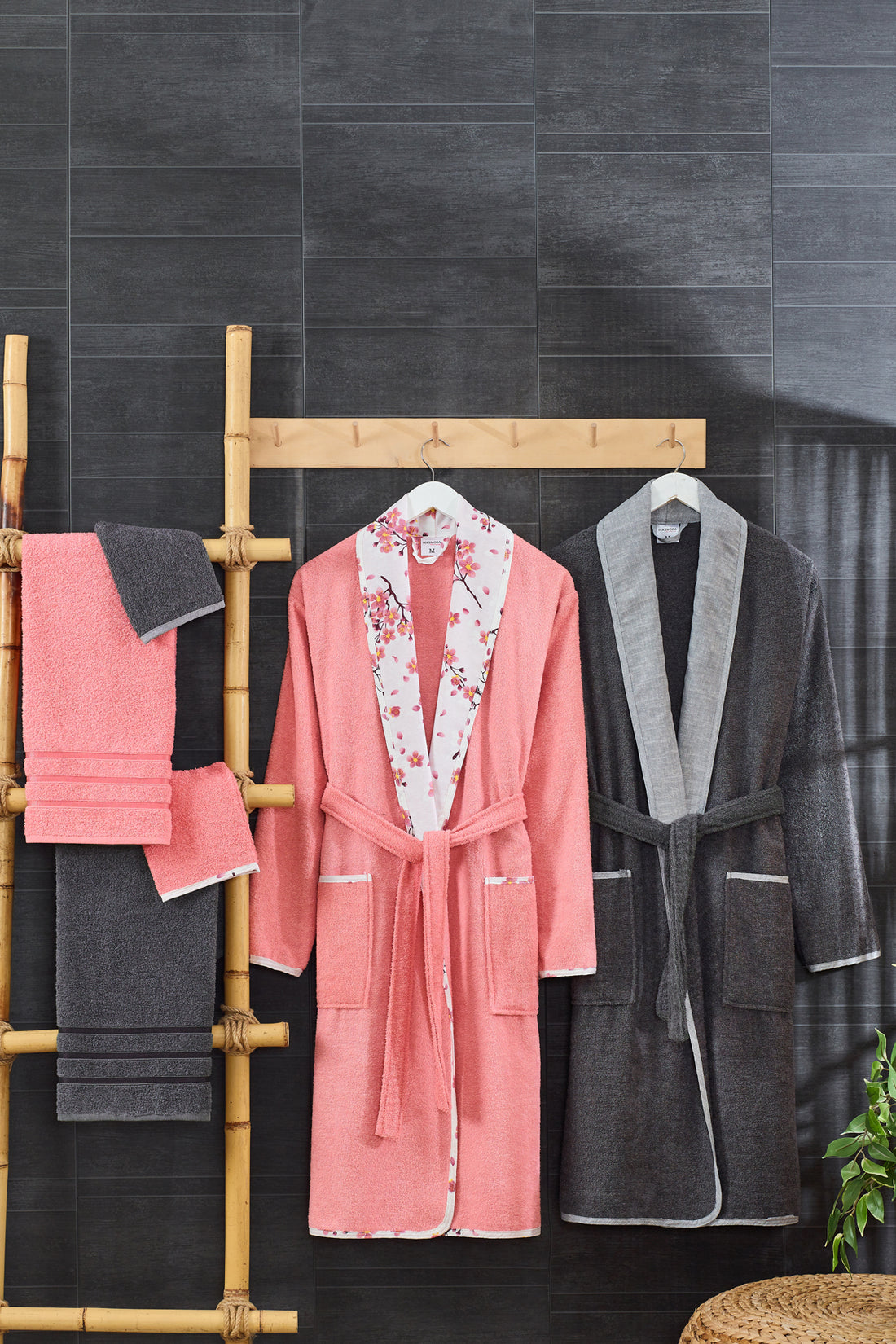 6 Parça Yetişkin Bornoz Takımı Çeyiz Seti Antrasit-Somon
